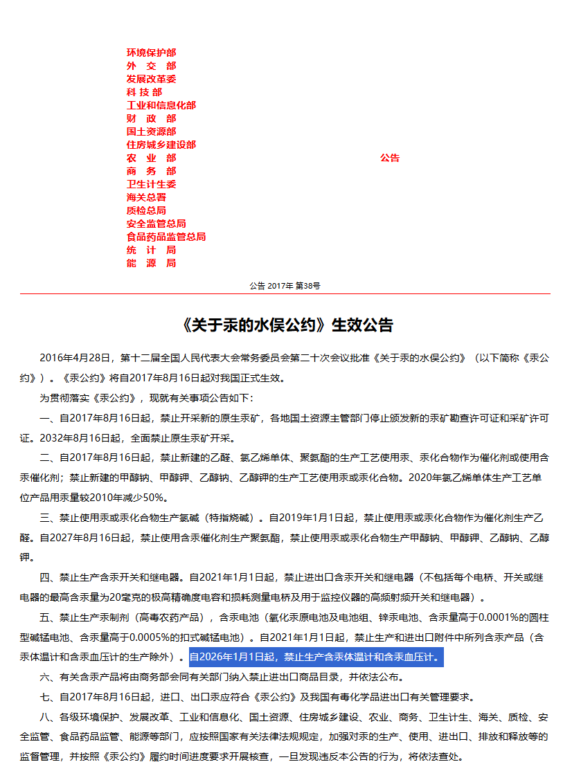 2017年8月15日,多部门联合发布《关于汞的水俣公约》生效公告,公告第五条提到“自2026年1月1日起,禁止生产含汞体温计和含汞血压计”;2020年,国家药监局综合司发布关于履行《关于汞的水俣公约》有关事项的通知,再一次强调,自2026年1月1日起,全面禁止生产含汞体温计和含汞血压计产品。